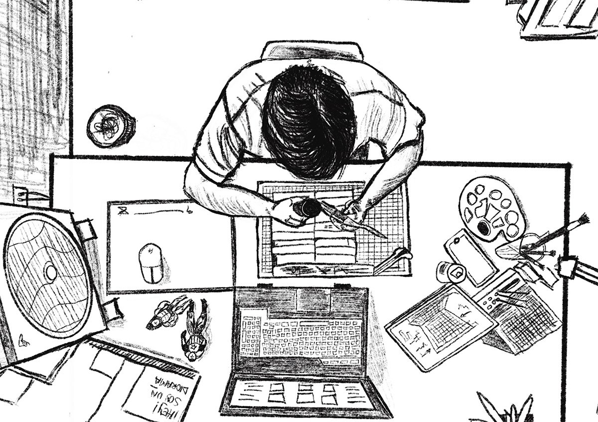 La ilustración lo representa en su espacio de trabajo, rodeado de los elementos que forman parte de su proceso creativo. Más que un retrato, la pieza funciona como una extensión de su identidad artística.