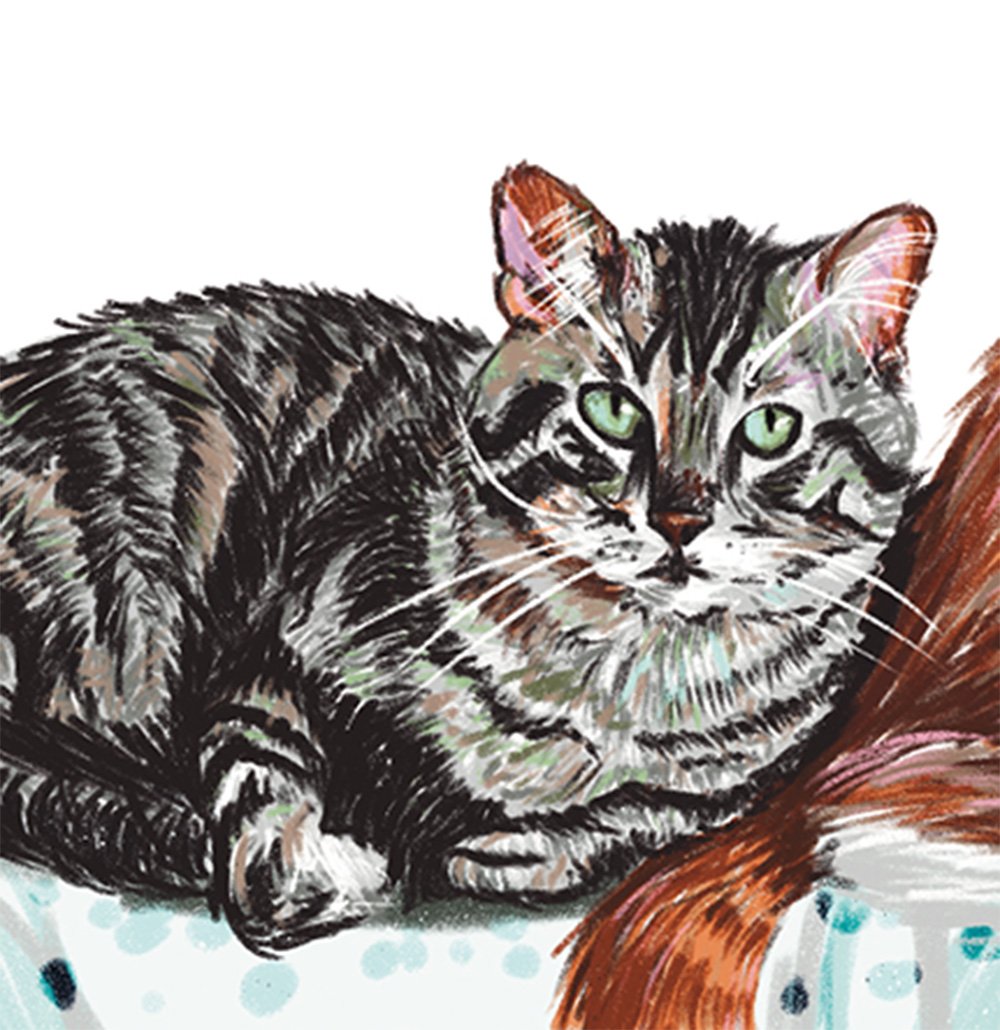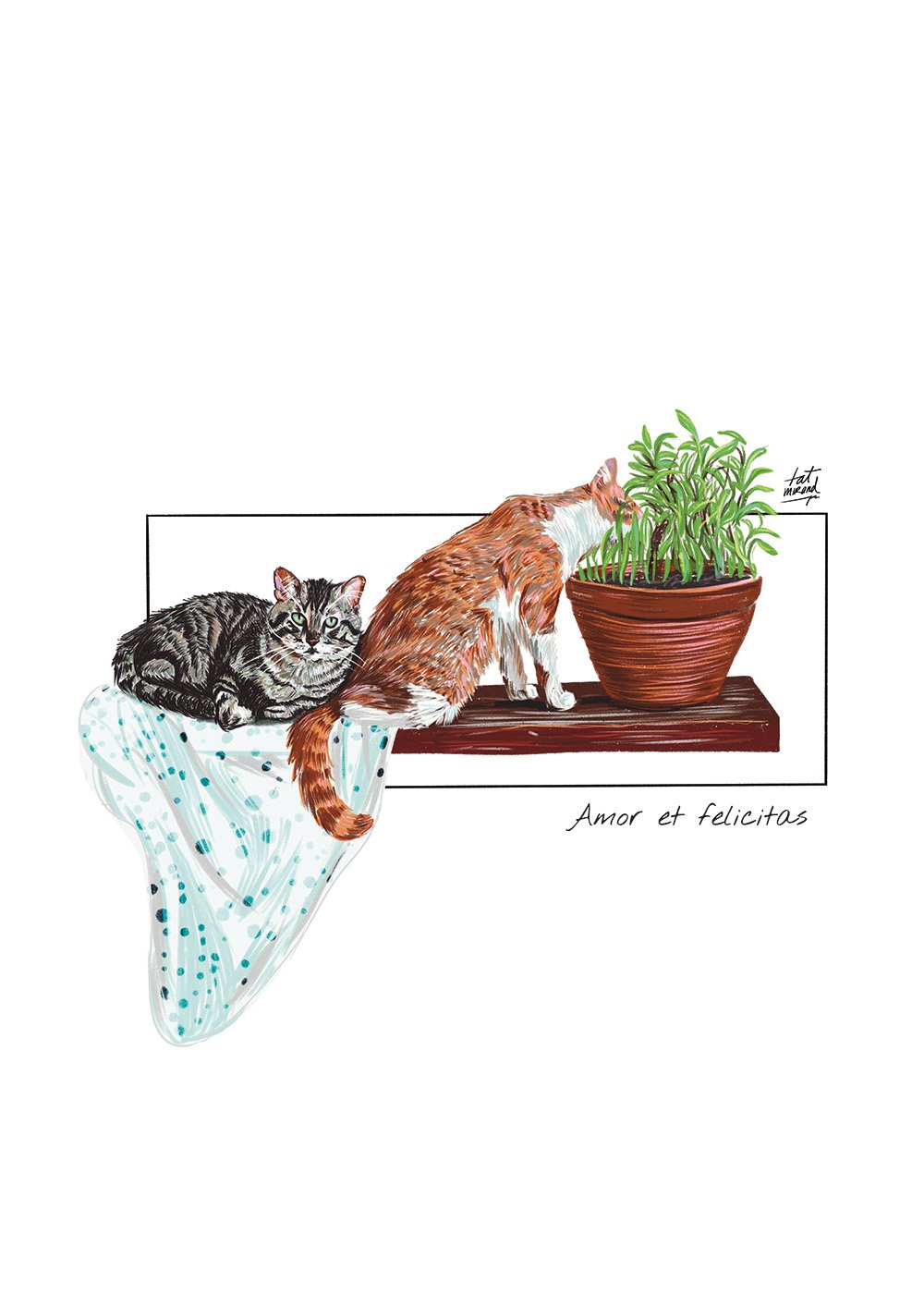 Ilustraciones de gatos desarrollada para un wallpaper decorativo y también adaptada como diseño impreso en polo. Una pieza versátil que celebra el carácter felino en distintos soportes.